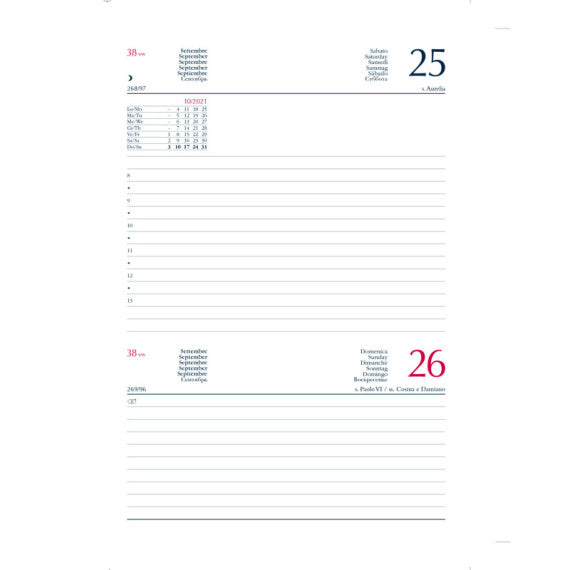Articolo in prenotazione, in consegna a partire dal mese di luglio 2024Agenda giornaliera a blocco fisso, copertina in carta imbottita, carta bianca con stampa a due colori. Sabato/Domenica abbinati.