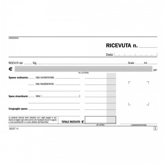 Blocco ricevute di condominio data ufficio 10x16,8 cm - 50x2 copie autoricalcanti - DU161370000