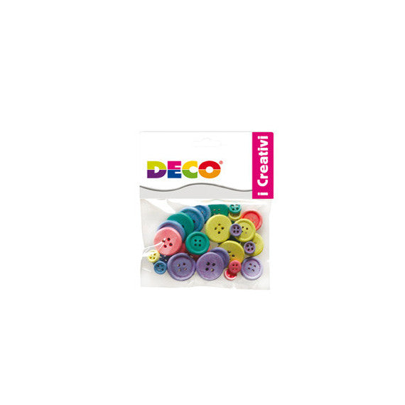 Confezione assortita di 30 bottoni in legno colori pastello.