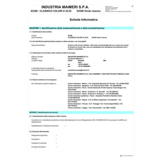 Colore a olio extrafine in tubetto di alluminio da 20 ml. Totale assenza di cere e componenti nocivi. Pasta pittorica morbida e lavorabile a spatola, ottima per velature o pittura a corpo. Equilibrio perfetto tra i tempi di essicazione di ogni tinta. Bianco e colori chiari prodotti con oli non ingiallenti. Concentrazione di pigmento elevata. Alta resistenza alla luce secondo la normativa ASTM - D4303 per i colori a oilio. Non richiedono fissaggio. Colore verde vescica.