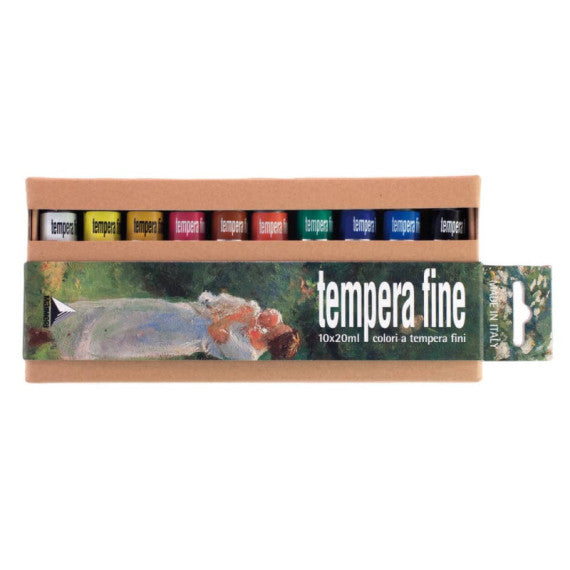 Colore a tempera fine in tubetto di alluminio da 20 ml. Grado di coprenza: semicoprente. Perfetta per le attività scolastiche. Pasta densa e corposa che rende il colore adatto anche a sfondi scuri. Alta resistenza alla luce secondo la normativa ASTM - D4303 per la tempera. Compatibili con tutti i colori e gli additivi per pittura ad acqua. Tempo di essicazione breve. Granulometria media 10 micron. Confezione da 10 colori assortiti.