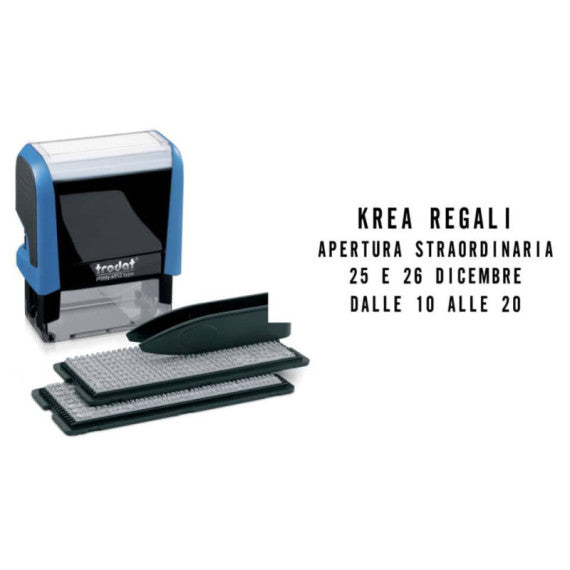 Timbro componibile. Permette la realizzazione di timbri personalizzati. Piastra 58x22 mm con 5 righe di testo possibili. Il set comprende: 1 timbro ad inchiostrazione automatica, 1 tamponcino nero, 1 serie di caratteri da 3 mm con 26 caratteri per riga, 1 serie di caratteri da 4 mm con 21 caratteri per riga, 1 pinzetta in plastica per il posizionamento dei caratteri.
