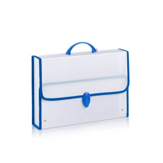 Valigetta Fine-Tex in polipropilene alveolare neutro con bordo arrotondato in tessuto di 2 cm cucito a mano. 1 chiusura. Formato 40(L)x28(H) dorso 8 cm. Completa di film protettivo. Colori accessori assortiti.